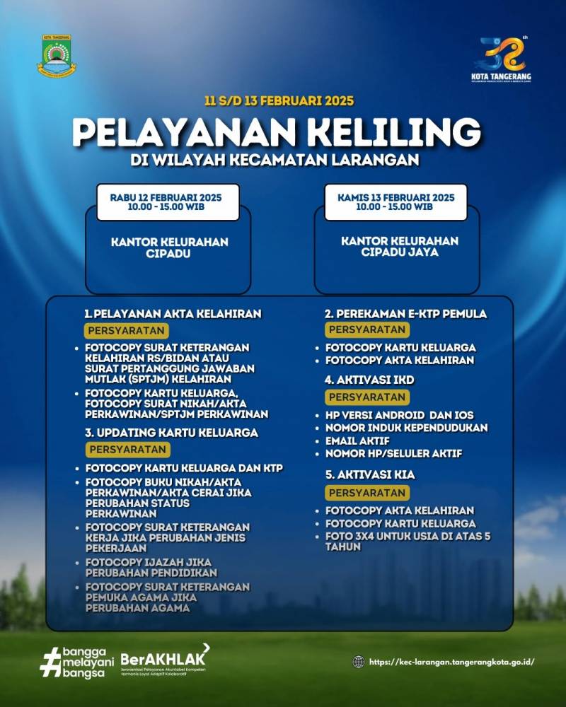 “Hari ini Pelayanan Adminduk Keliling berlangsung di Kelurahan Larangan Utara. Selanjutnya, pada Rabu 12 Februari berlangsung di Kantor Kelurahan Cipadu dan Kamis 13 Februari berlangsung di Kantor Kelurahan Cipadu Jaya,” ungkap Nasrullah, Selasa (11/2/25).