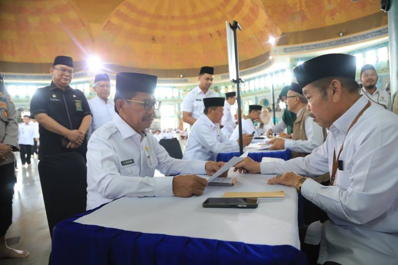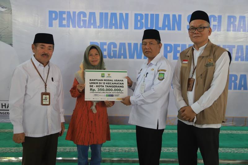 Pemerintah Kota (Pemkot) Tangerang berkolaborasi dengan Badan Amil Zakat Nasional (BAZNAS) Kota Tangerang melakukan penyaluran bantuan modal usaha hingga Pemberian Makanan Tambahan (PMT) stunting hingga Rp1,89 miliar, di Masjid Raya Al-A’zhom, Kota Tangerang, Rabu (19/3/25).
