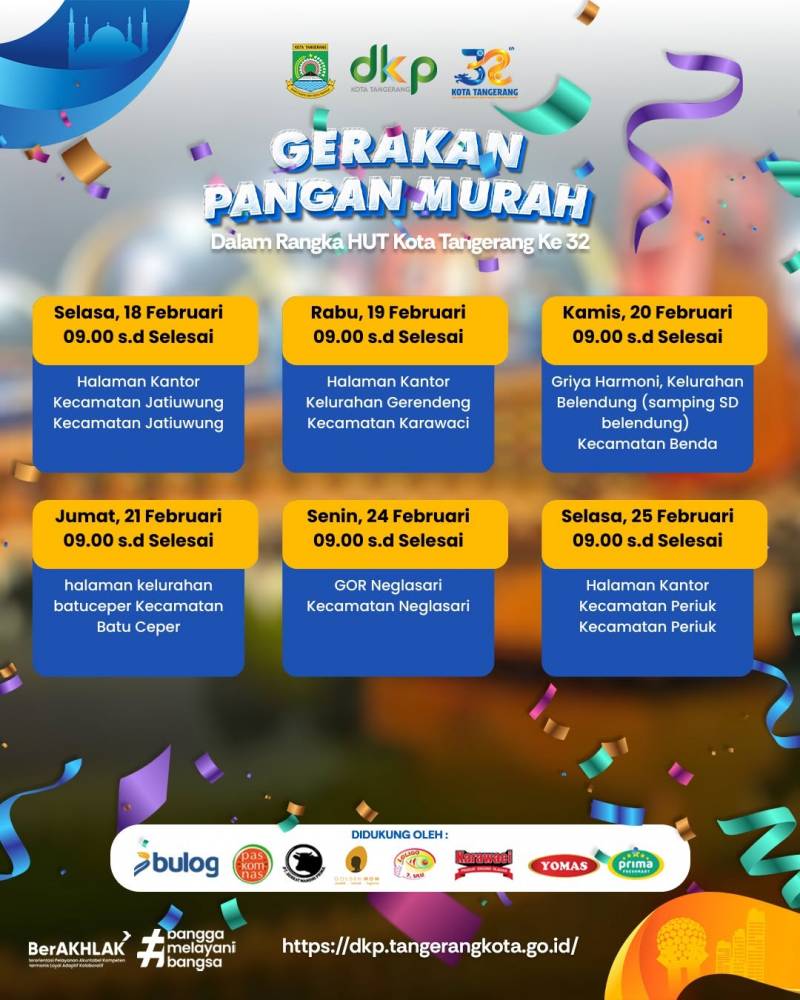 Dalam rangka Hari Ulang Tahun (HUT) Ke-32 Kota Tangerang, Pemerintah Kota (Pemkot) Tangerang melalui Dinas Ketahanan Pangan (DKP) akan menggelar Gerakan Pangan Murah (GPM) di 13 kecamatan secara berkala, mulai 7 hingga 25 Februari mendatang.