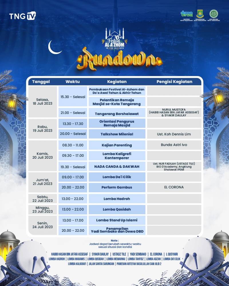 "Berbagai kegiatan perlombaan sengaja ketika rancang secara kreatif di Festival Al-A'zhom 2023 ini. Selain untuk melestarikan tradisi-tradisi Islami, juga sebagai syi'ar Islami yang kreatif di Kota Tangerang," ujar Ketua Pelaksana Festival Al-A'zhom 2023, Ikhwan Sukirman, Selasa, (18/7/23).