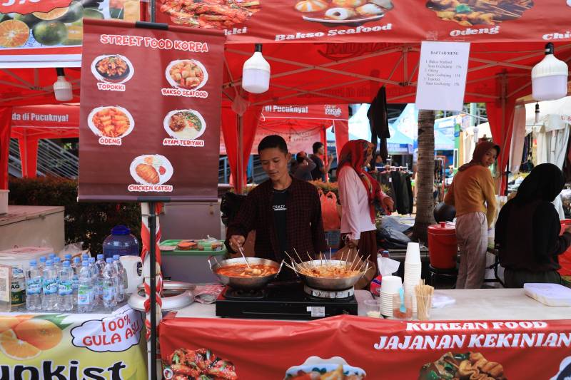 Rekomendasi kuliner selanjutnya ialah makanan khas dari negeri gingseng Korea Selatan. Namun jangan salah, harga yang dibandrol masih sangat terjangkau. Pada stand ini, terdapat beragam menu jajanan yakni tteokbokki (topokki), odeng, bakso seafood, ayam teriyaki, dan chicken katsu. Semunya dijual kisaran harga Rp15 ribu per porsinya.