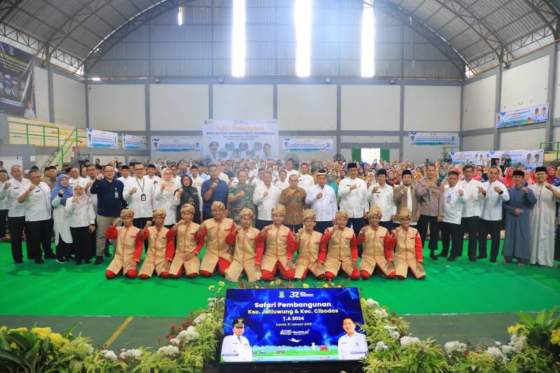 Hari kelima Safari Pembangunan Pemkot Tangerang Tahun Anggaran (TA) 2024, berlangsung di Kecamatan Jatiuwung dilengkapi dengan stand job fair, cek kesehatan, enkapsulasi, layanan kependudukan hingga stand UMKM, di GOR Jatiuwung, Jumat (31/1/25).