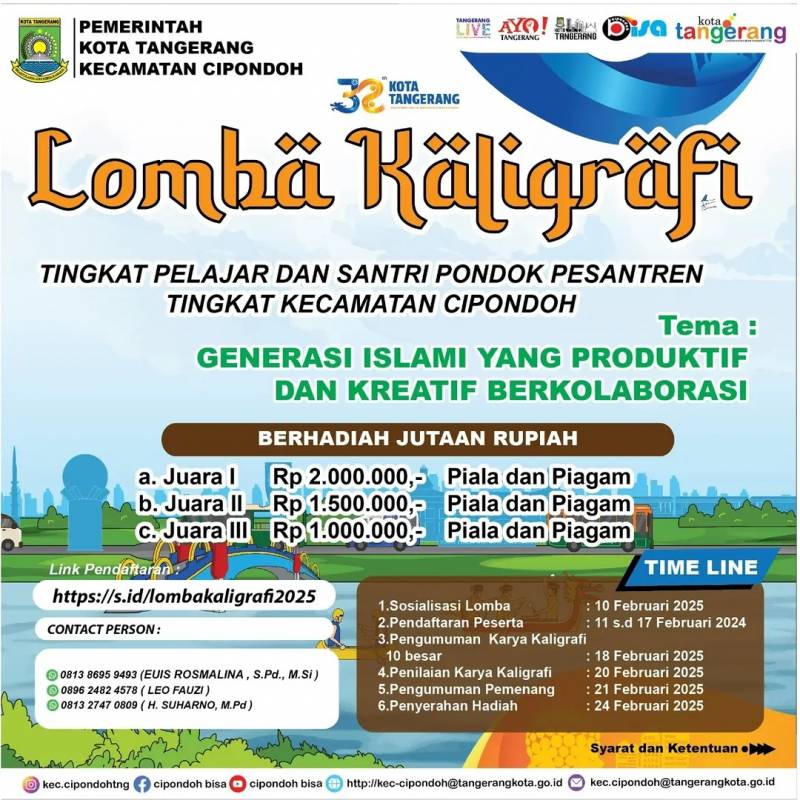 "Khusus untuk pendaftaran lomba kaligrafi akan berakhir hingga 17 Februari 2025. Untuk warga Kecamatan Cipondoh, silakan daftar dan ikuti seluruh perlombaan yang sesuai dengan kategori dan persyaratan yang berlaku," tutupnya.