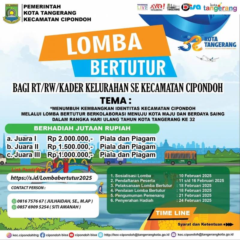 Sebagai informasi, pendaftaran perlombaan dapat dilakukan melalui pranala s.id/Lombabertutur2025, s.id/lombafotografi2025, dan s.id/lombakaligrafi2025. Informasi dan persyaratan lainnya, dapat dilihat melalui Instagram @kec.cipondohtng.